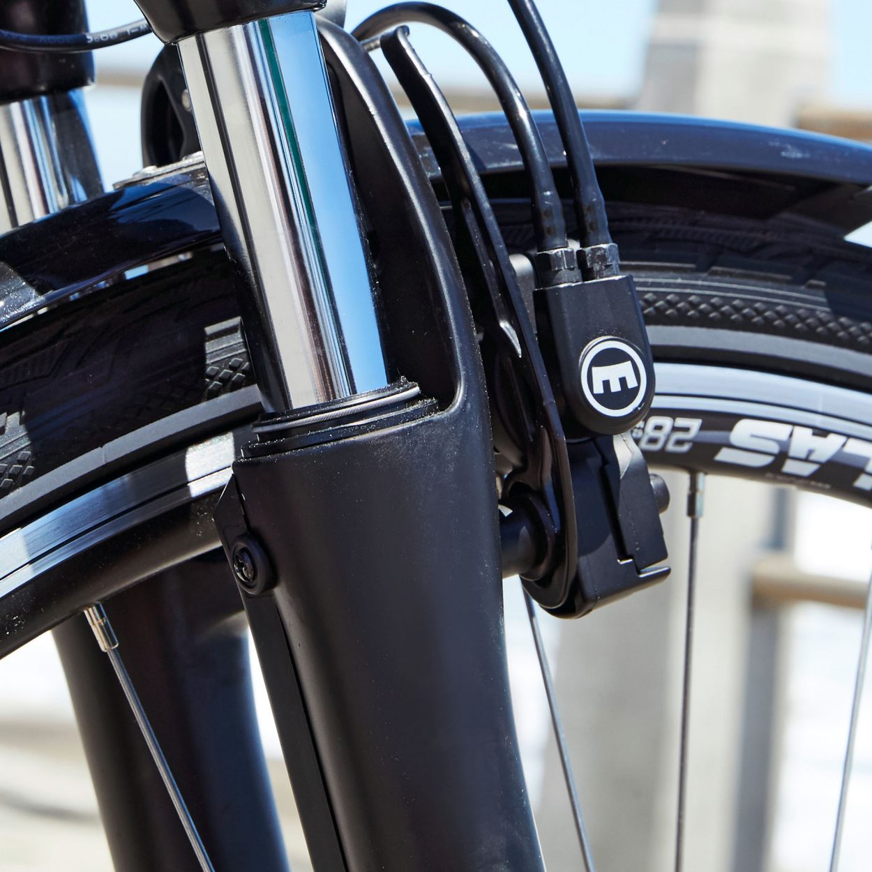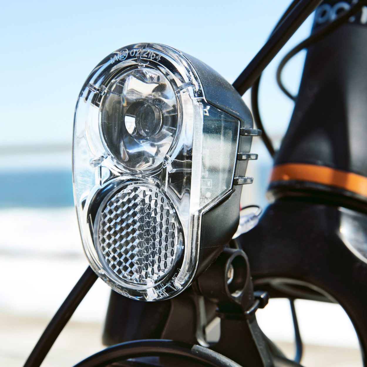 Der Vorbau ist winkelverstellbar und lässt sich so an verschiedene Fahrer anpassen. Die ergonomischen Lenkergriffe tragen ihren Teil zu einer entspannten Fahrt bei. Auch wieder an Bord: Suntour Federgabel, Selle Royal Gel City-Sattel und AXA LED-Beleuchtung mit Speisung aus dem E-Bike Akku.